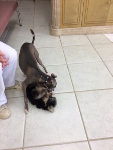 プレイセッションでは、前回は緊張気味でしたが、今回はイタグレくんとすっかり打ち解けてはしゃぎ回っていました。子犬が社会化期に他の犬と触れ合うことはとても重要なことです。当院のパピーケア教室では毎回プレイセッションの時間を設け、子犬が色々な経験を積めるように工夫しております。