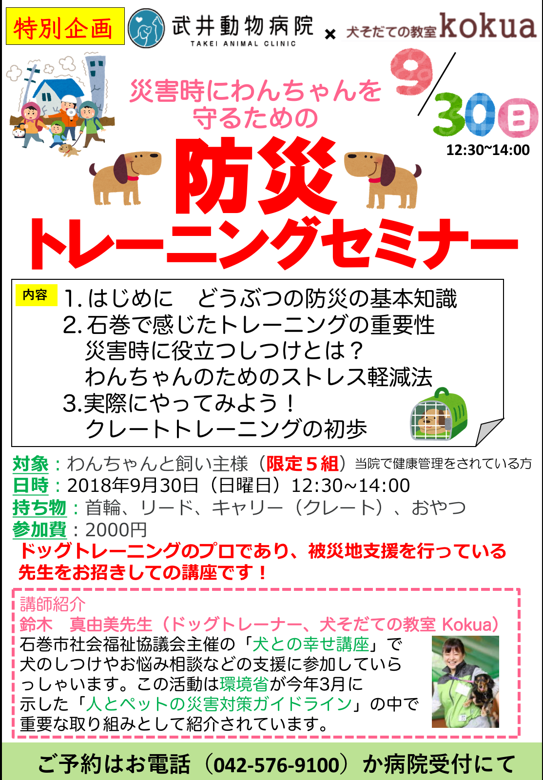 災害時にわんちゃんを守るための防災トレーニングセミナーのご案内です。